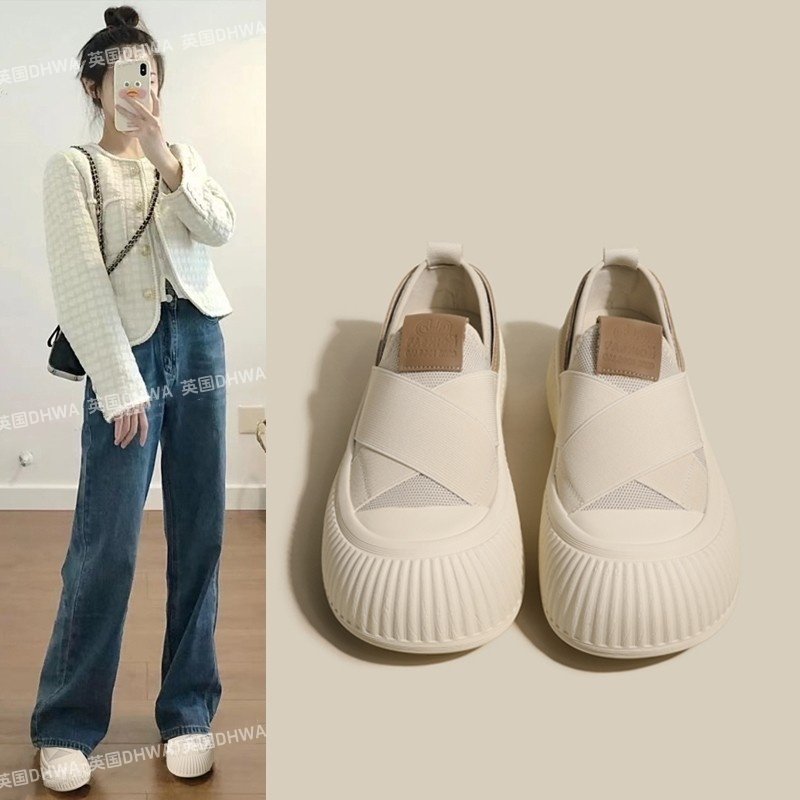 British Dhwa White Shoes Spring and Summer Thick-Soled Round-Toe Biscuit Canvas Shoes Slip-On Sneakers Soft-Soled Casual Shoes