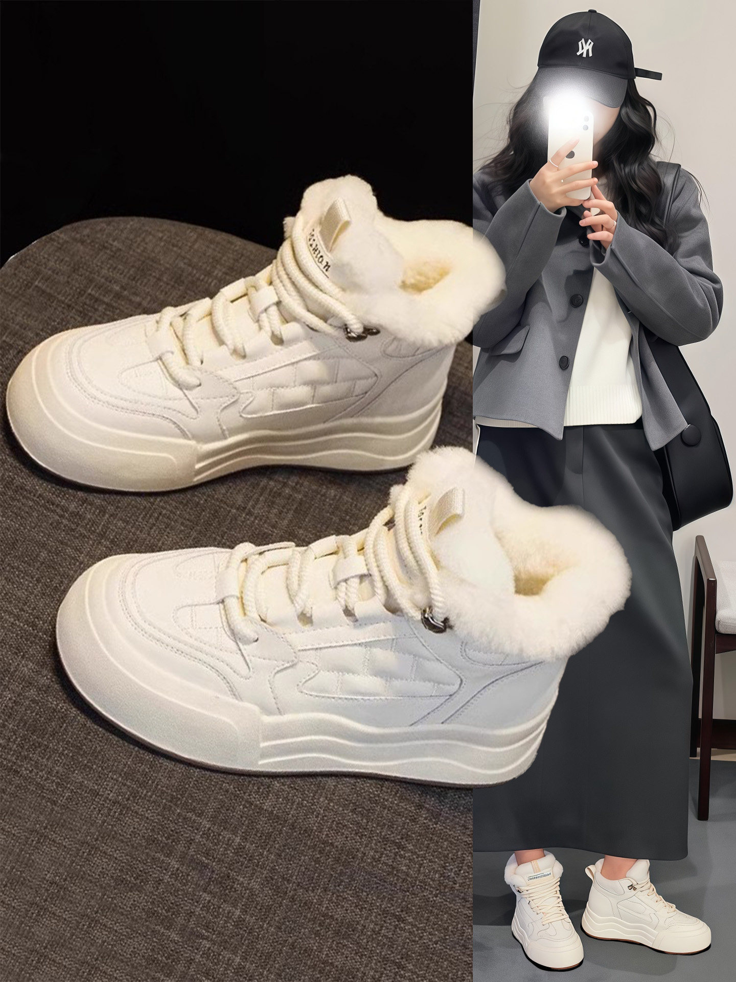 Hong Kong 2025 Autumn and Winter New Genuine Leather High-Top Shoes for Women, Street Style Casual Shoes, Fleece-Lined Thick-Soled Snow Boots, Sneakers, Cotton Shoes