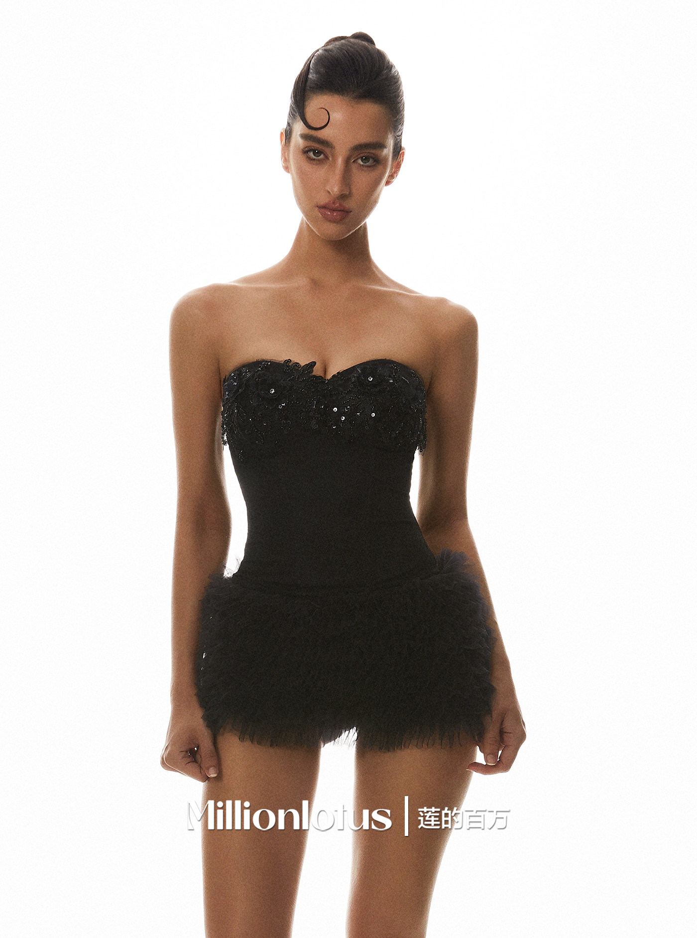Lian's Million Heavy Embroidery Black Fishbone Corset Special Hip-Enhancing Short Skirt Set