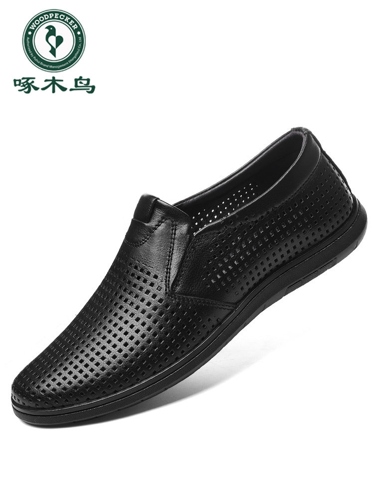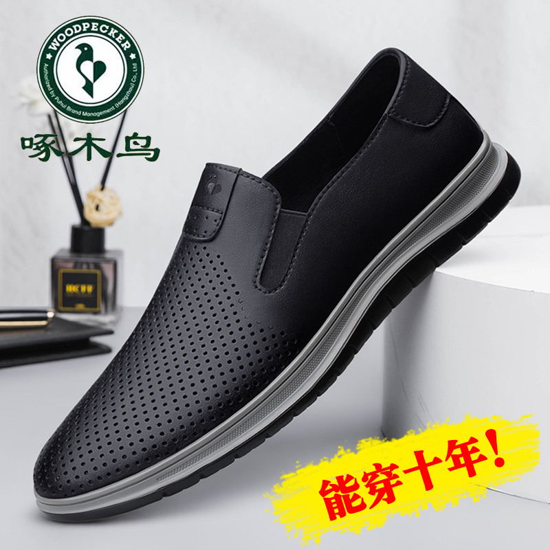 Woodpecker Men's Shoes 2025 Summer New Genuine Leather Hollow Breathable Casual Leather Shoes Men's Non-Slip Soft Sole Slip-On Shoes