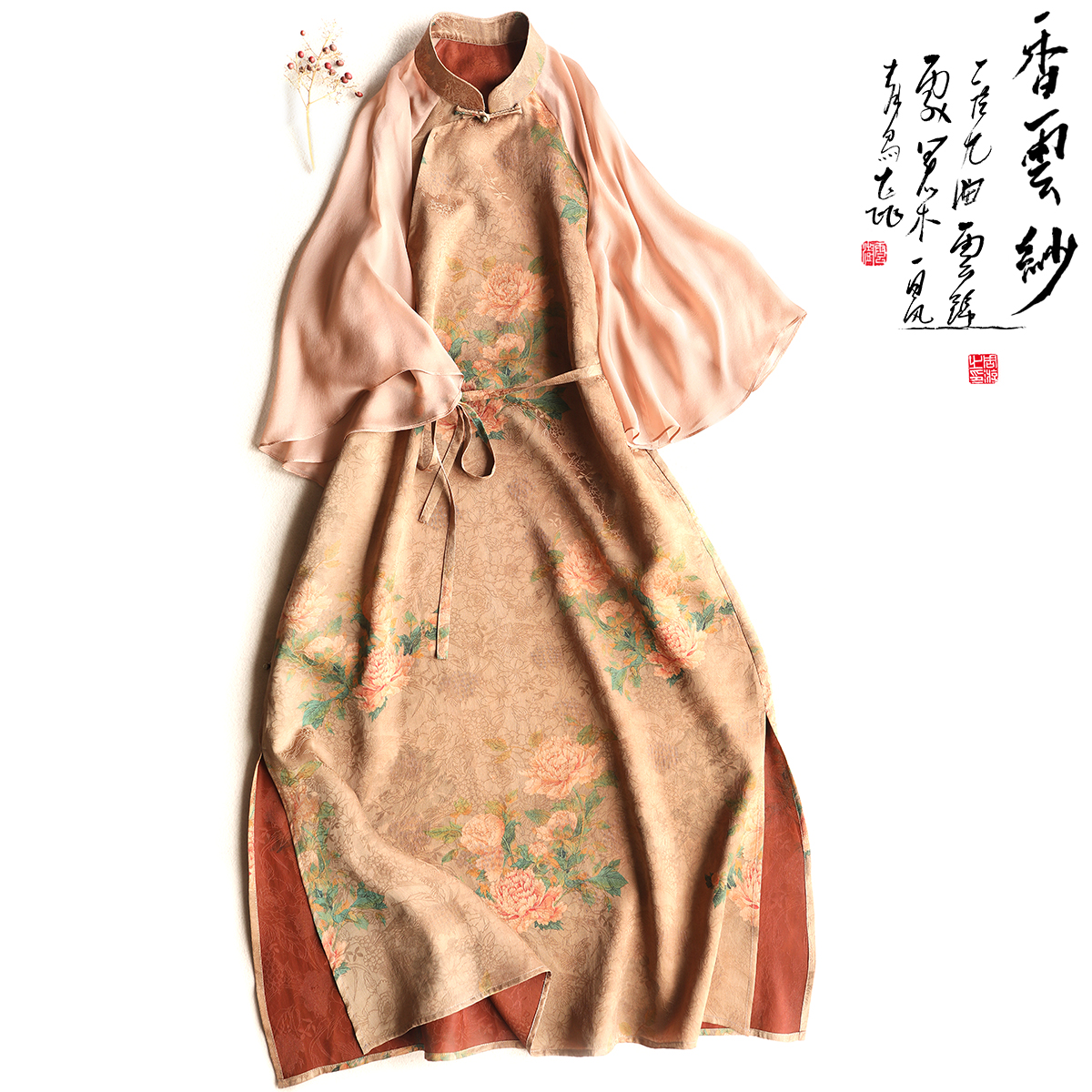 Yunshu Original Floral Fragrant Cloud Silk Dress, Retro Literary Improved Cheongsam Long Dress, Summer Gentle Style Tie-Up Dress
