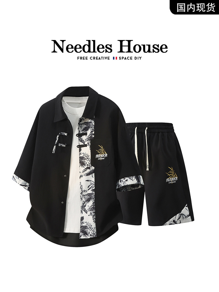 Needles House New Summer Style Chinese Style Short-Sleeved Shirt Suit Thin Loose Casual Sports Two-Piece Set