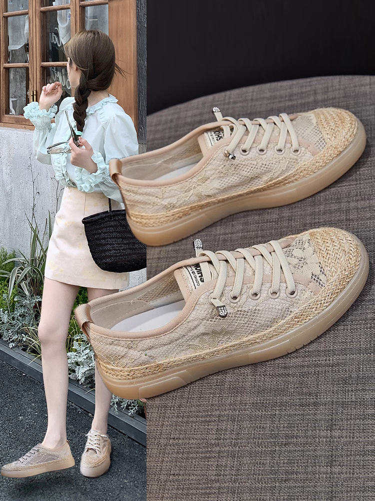 Hong Kong Fisherman Shoes for Women, Flat-Soled, 2025 Spring and Autumn New Lace Casual Shoes, Fashionable Chanel-Style Breathable Mesh Shoes for Women