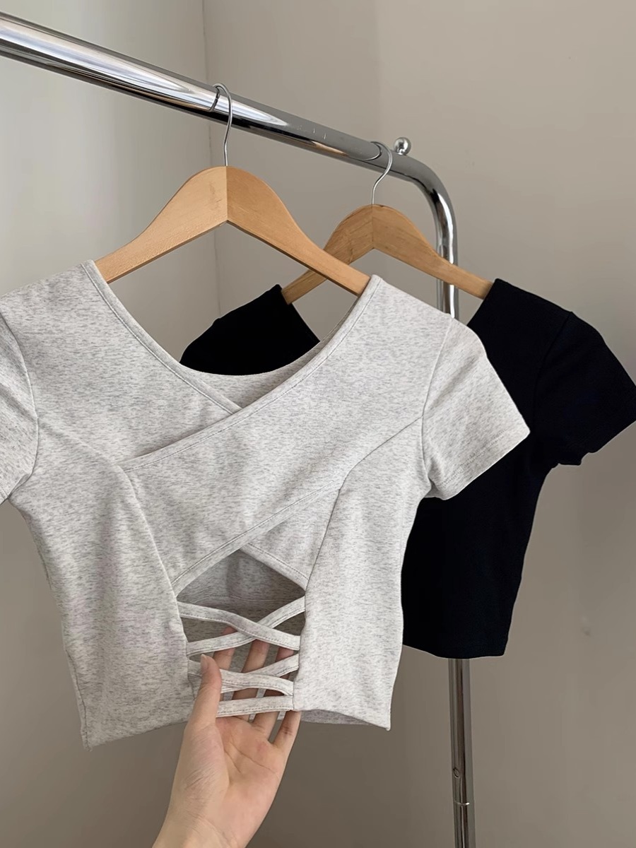 Sweet and Spicy Right Shoulder Backless Short Sleeve T-Shirt Women's Summer Short No-Wear Underwear with Breast Pad Design Slim Fit Top