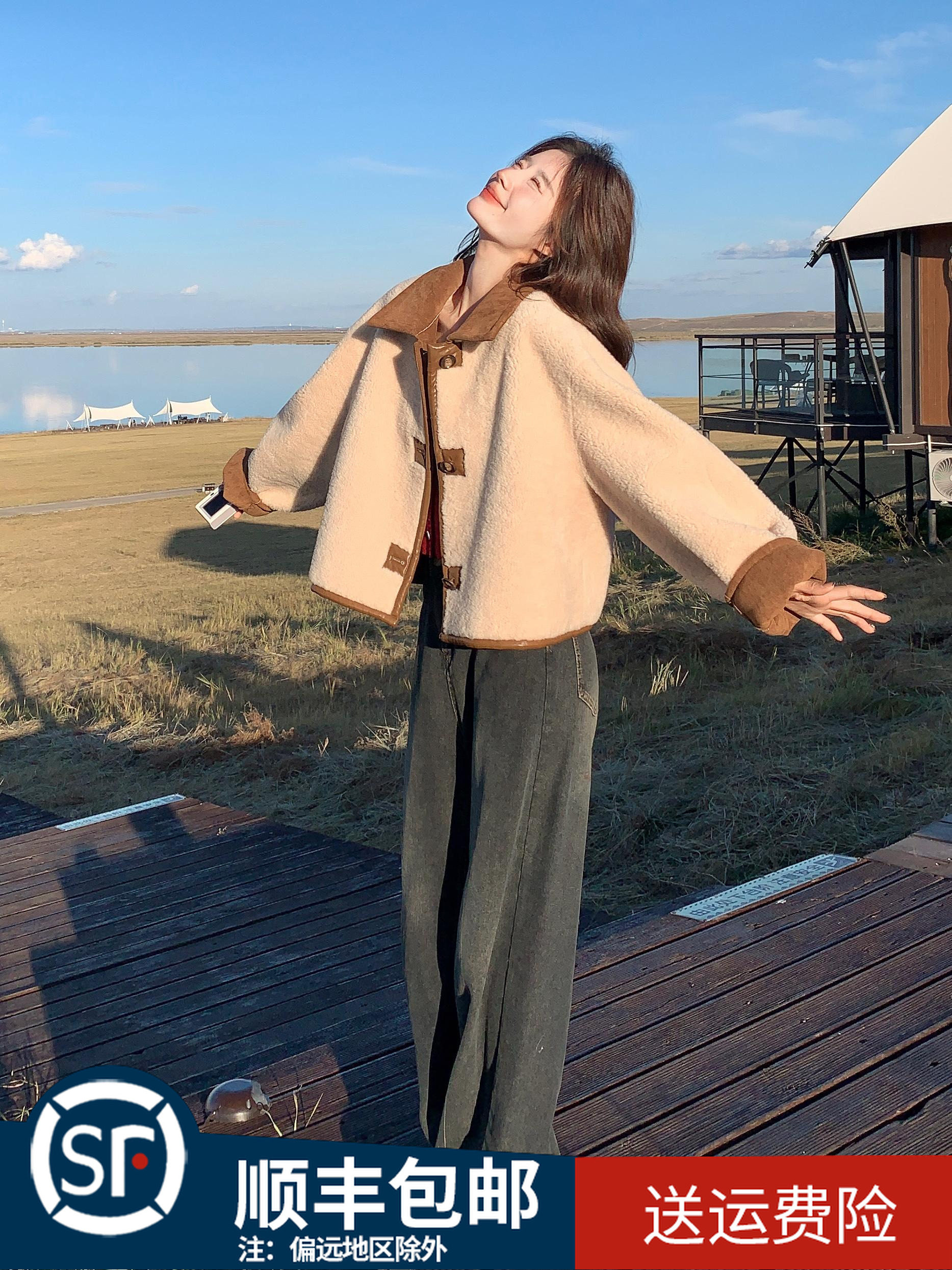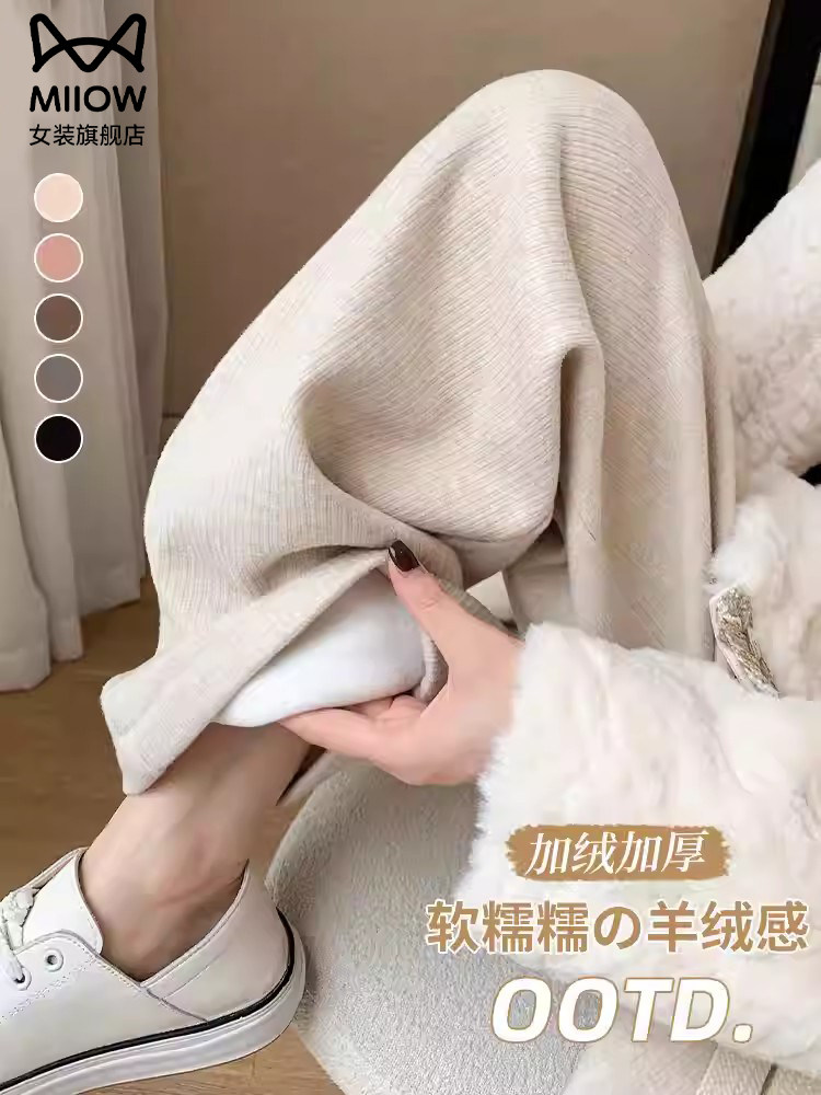 Cat People Narrow-Fit Fleece-Lined Wide-Leg Pants for Women, Autumn and Winter Thickened High-Waisted Drapey Straight-Leg Casual Knit Pants for Petite Women