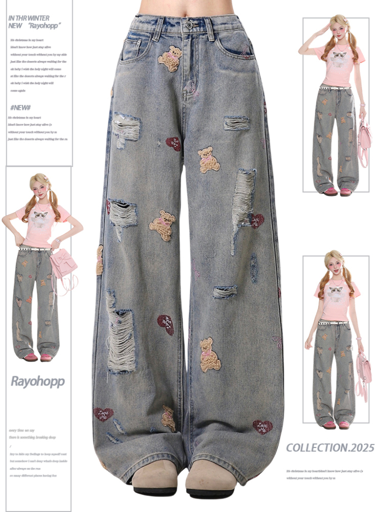 Rayohopp Bear Embroidered Ripped Jeans for Women, New Autumn Trendy High Street Design, Loose Wide-Leg Pants
