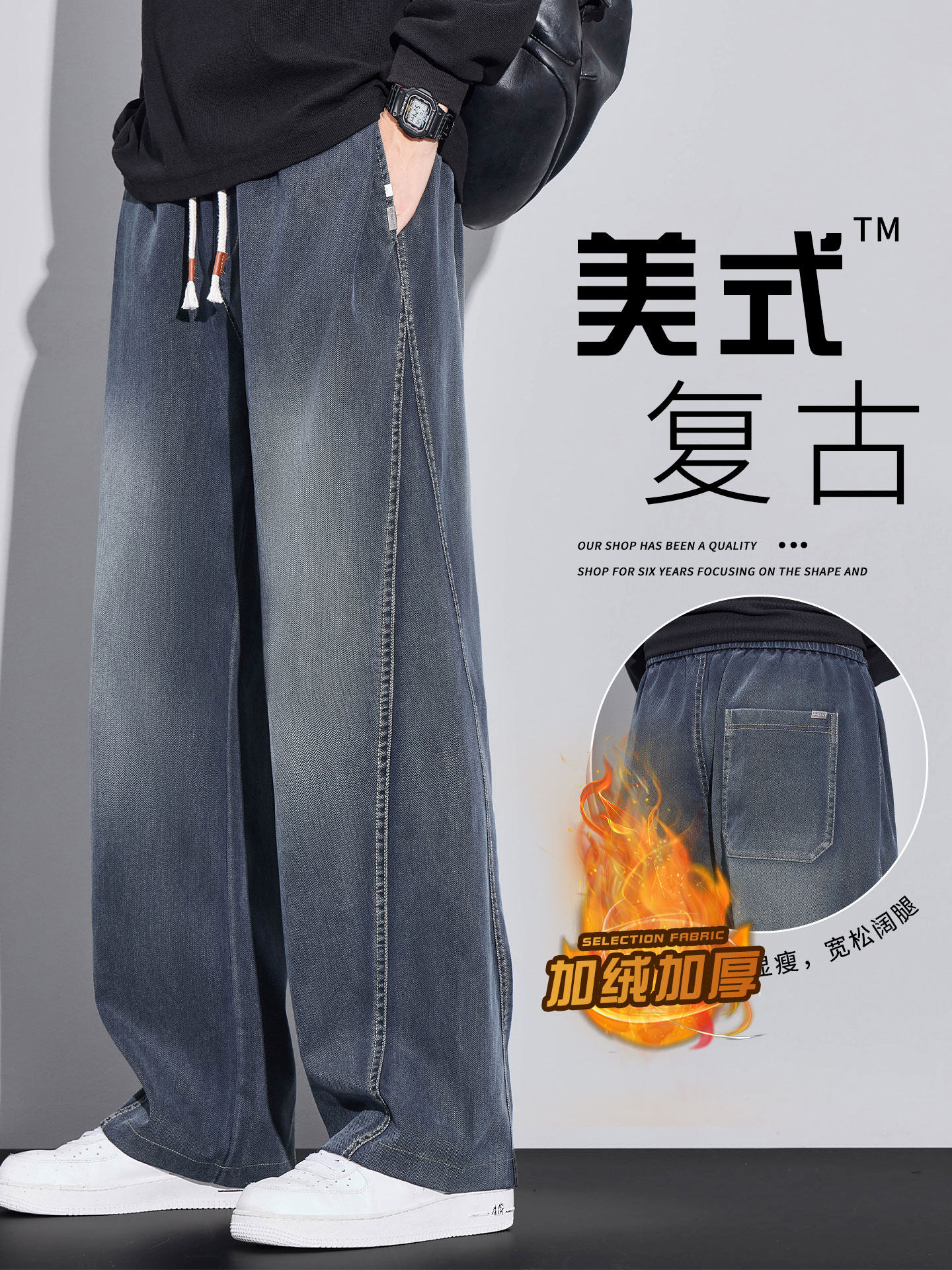 2025 Autumn/Winter New Men's Jeans Straight Loose American Style Trendy Casual Wide Leg Fleece-Lined Long Pants for Men