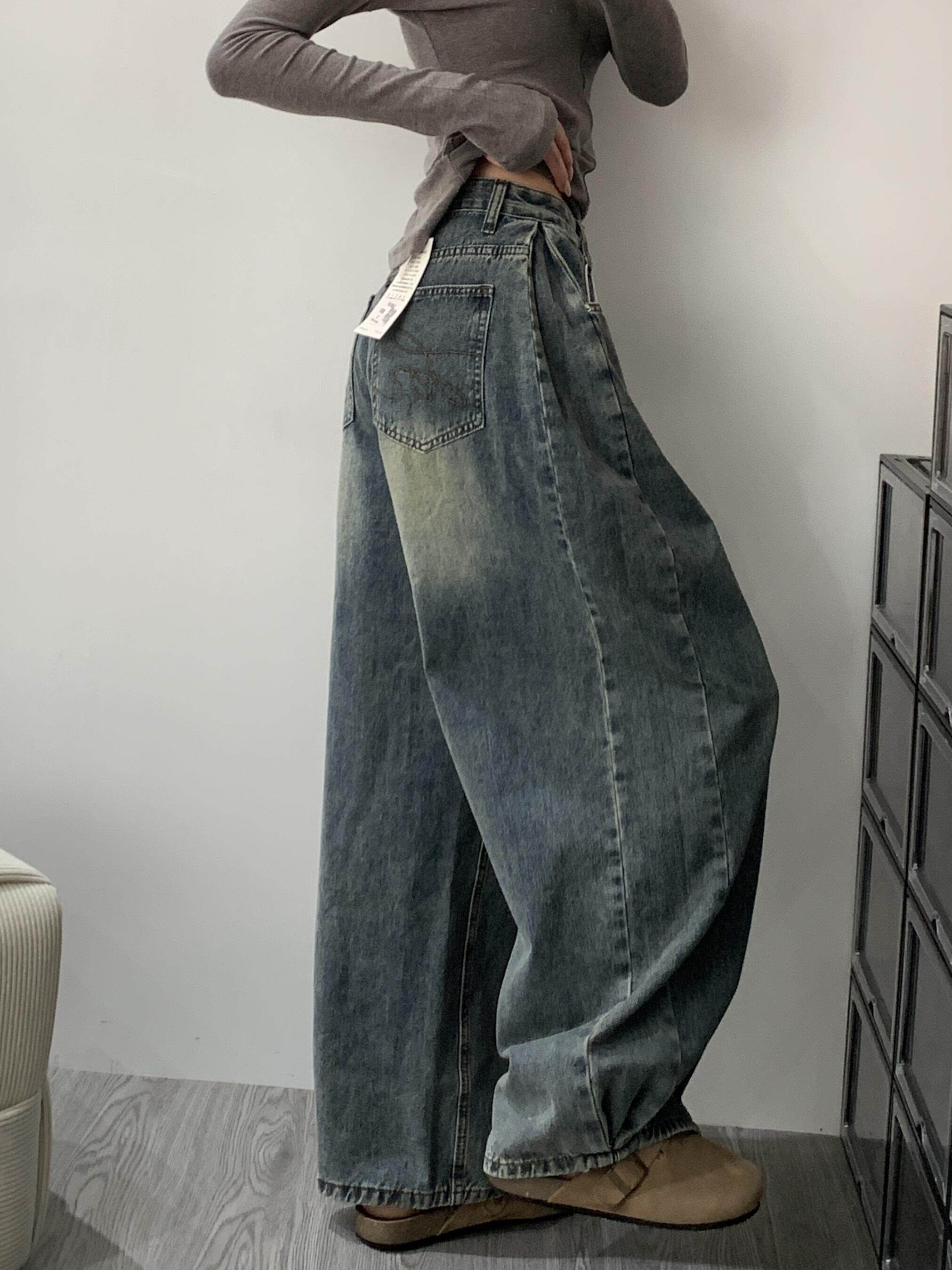 Designed Pleated Casual Wide-Leg Jeans for Women, New Spring Style, American Retro Washed and Distressed High-Waisted Floor-Length Pants
