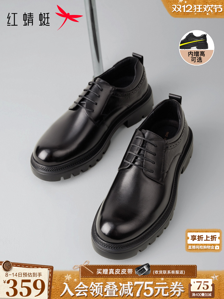 Red Dragonfly Men's Leather Shoes New Style Men's Shoes Thick-Soled Derby Shoes with Internal Height Increase Formal Leather Shoes Large Toe Wedding Groom Shoes