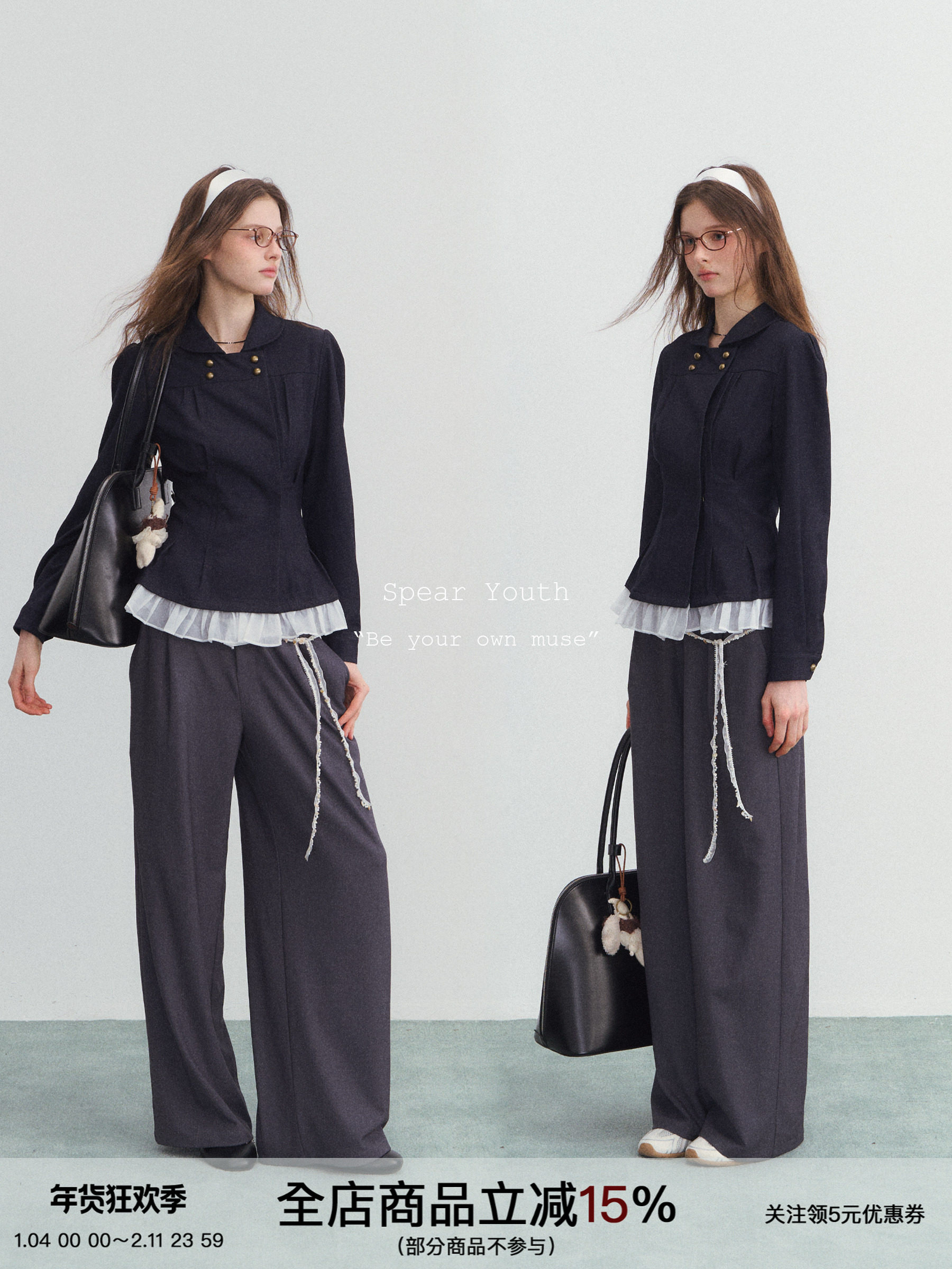 Spear Youth "Unparalleled" Double-Breasted Denim Pleated Waist Shirt Commuter Top Jacket