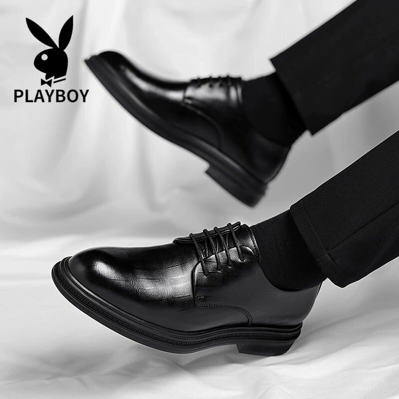 Playboy Men's Shoes for Autumn and Winter, British Style Business Lace-Up Formal Leather Shoes, Genuine Leather Height-Increasing Wedding Groom Shoes