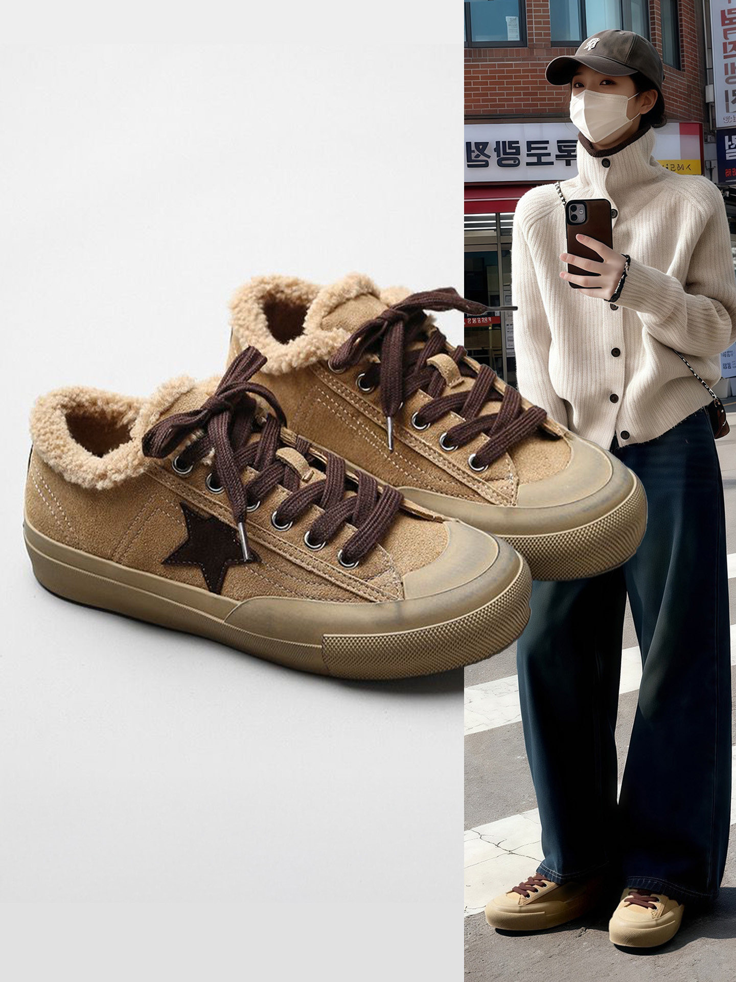 Hong Kong Retro Lamb Wool Fleece-Lined Warm Casual Sneakers Genuine Leather Thick-Soled Round-Toe Lace-Up Star Distressed Dirty Shoes