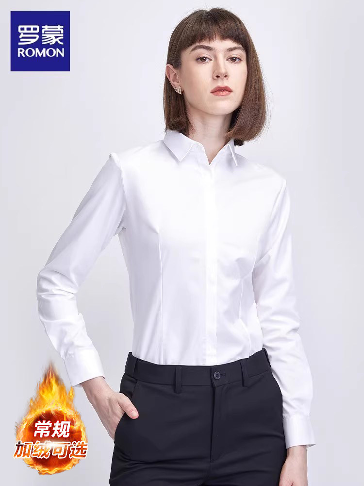 Romon's New Autumn and Winter White Long-Sleeved Women's Shirt for Work, Fleece-Lined Shirt, Professional Commuting Formal Wear, Blue Work Clothes