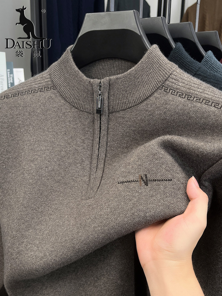 Kangaroo Winter Sweater for Men, Middle-Aged and Elderly, Thickened and Warm, Dad's Style, Half-High Collar, Zippered Knitwear, Base Layer Shirt