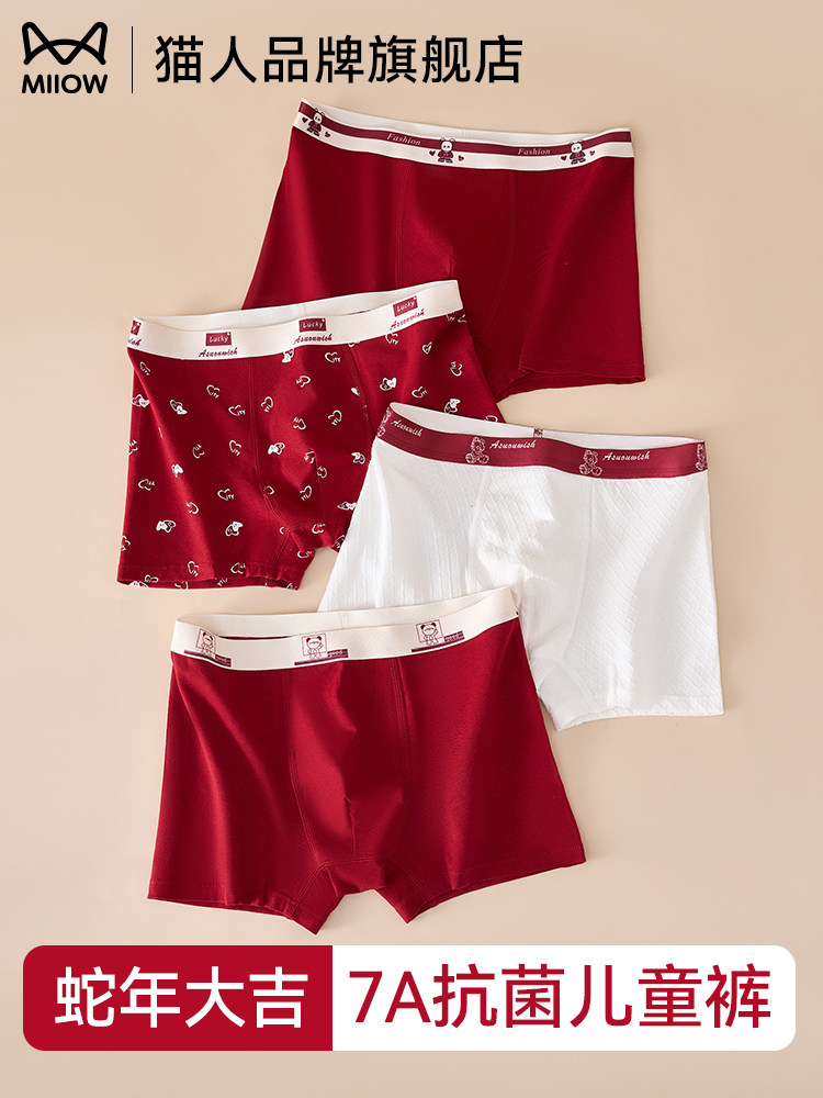 Catman Teenage Underwear for Boys, Red Cotton for the Year of Birth, Antibacterial Mulberry Silk Boxer Briefs for Developmental Stage, Medium and Large Children