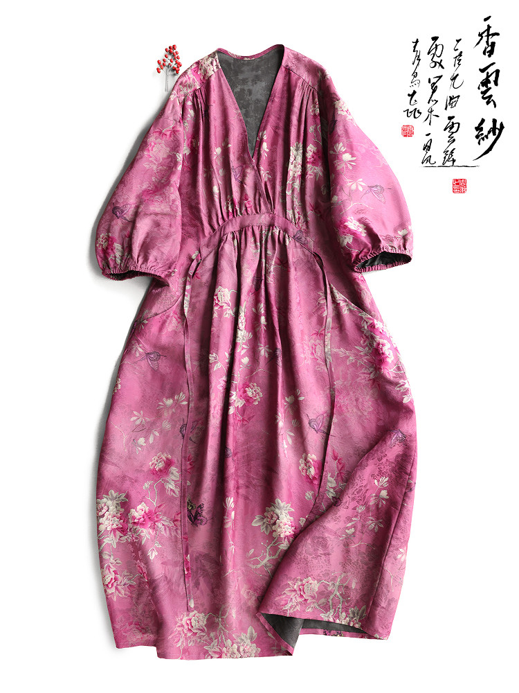 Yunshu Original Interwoven Xiangyun Silk French Artistic Retro V-Neck Flared Waist-Cinching Long Dress Summer New Style