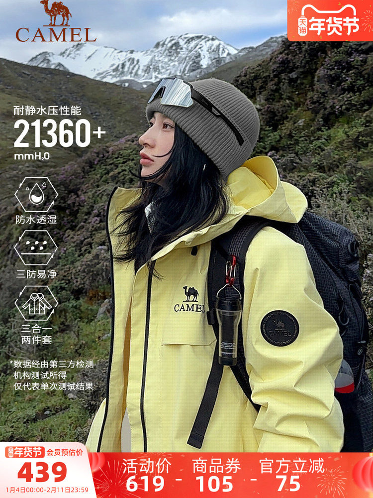 Camel Rain God Jacket 2.0 Version Three-In-One New Moon Shadow Yellow Jacket Men's and Women's Outdoor Waterproof Mountaineering Clothing