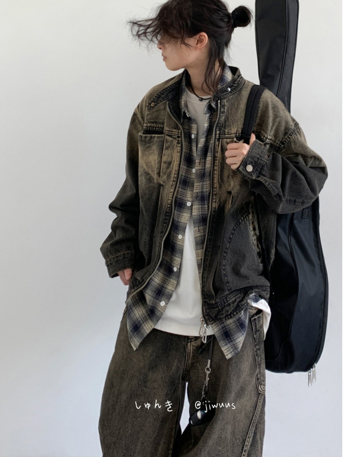 Jiwuus Japanese Retro Distressed Denim Jacket for Men and Women, Collarless, Loose, Cool Black Long-Sleeve Jacket