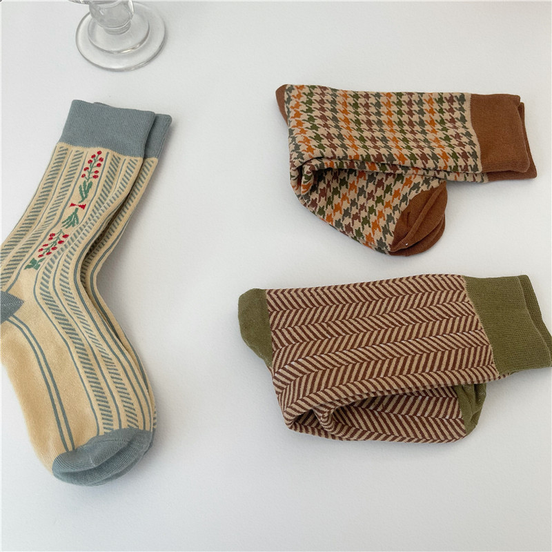 New Autumn and Winter Women's Houndstooth Series Floral Cotton Socks, Retro Niche Versatile Mid-Calf Japanese-Style Cotton Socks