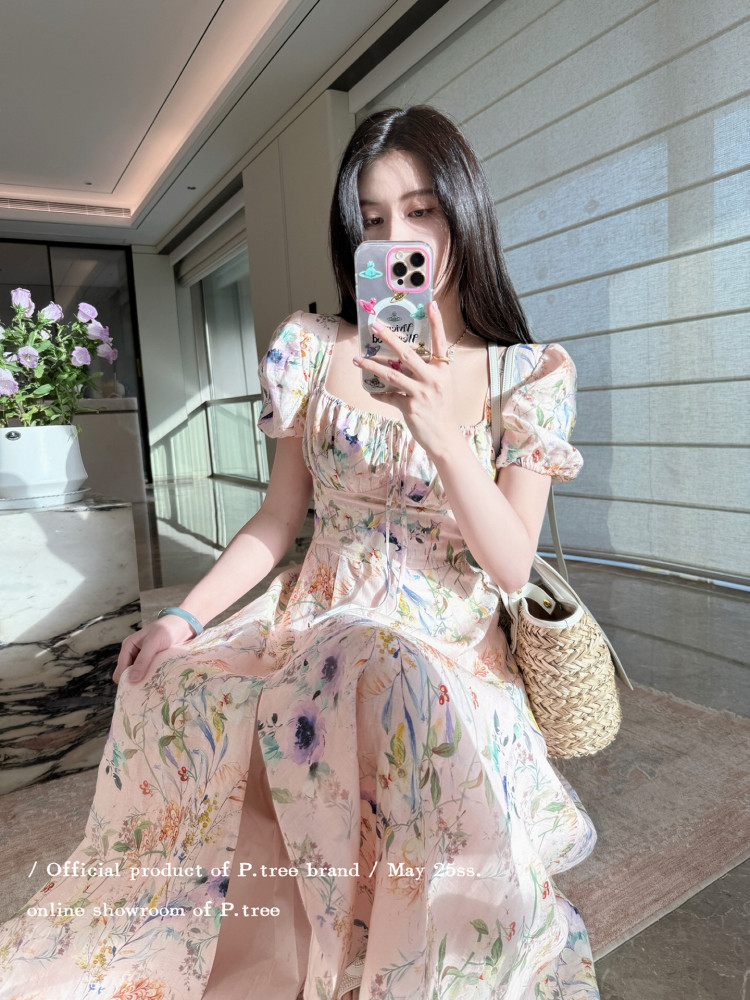 P.Tree “Versailles Pink and White” 100% Pure Linen Slimming Classic French Dress