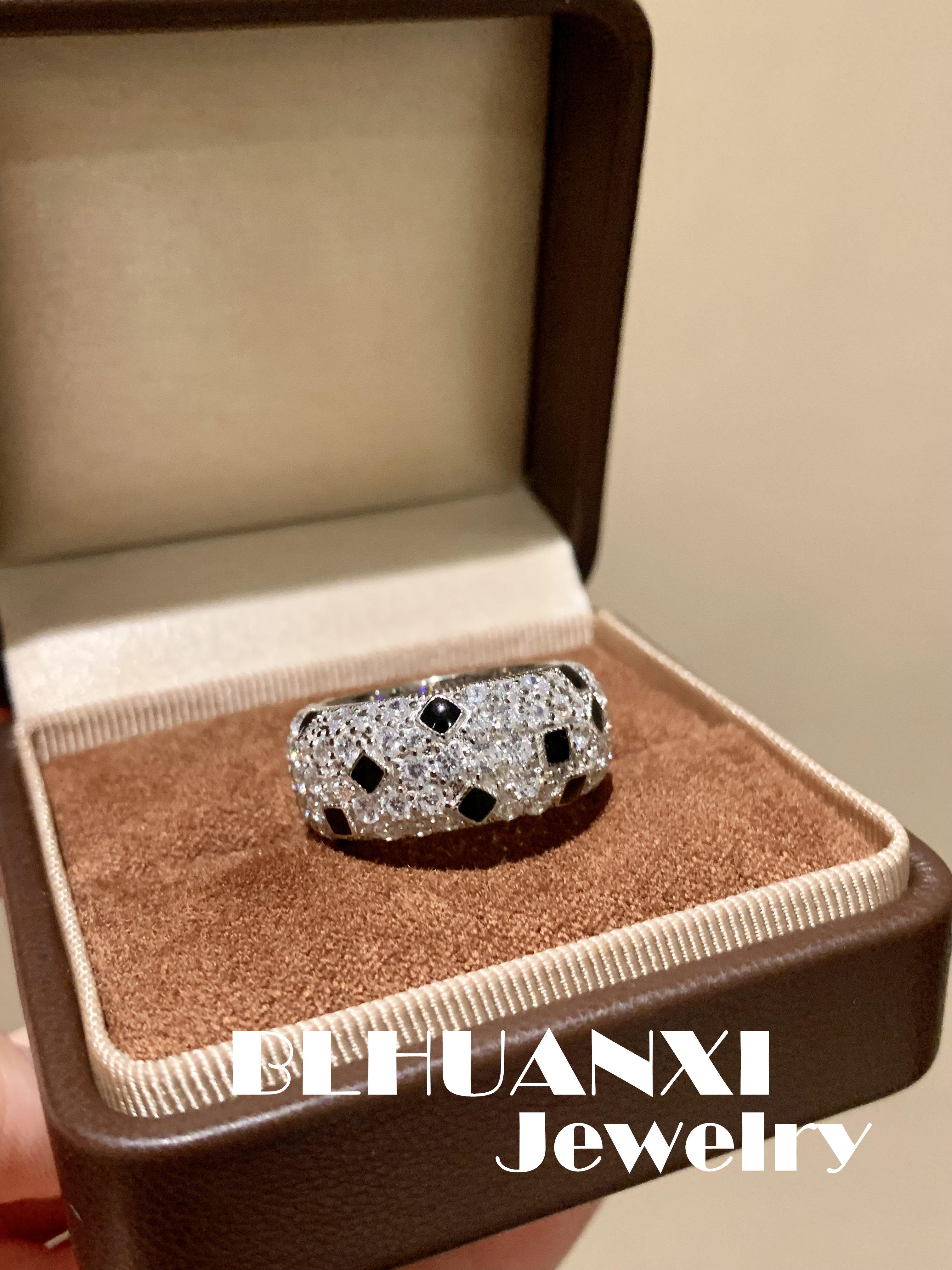 【Look for Joy】925 Silver Gold-Plated New Wide Version Heavy-Duty Leopard Print Ring with Black Enamel, Light Luxury and Non-Fading