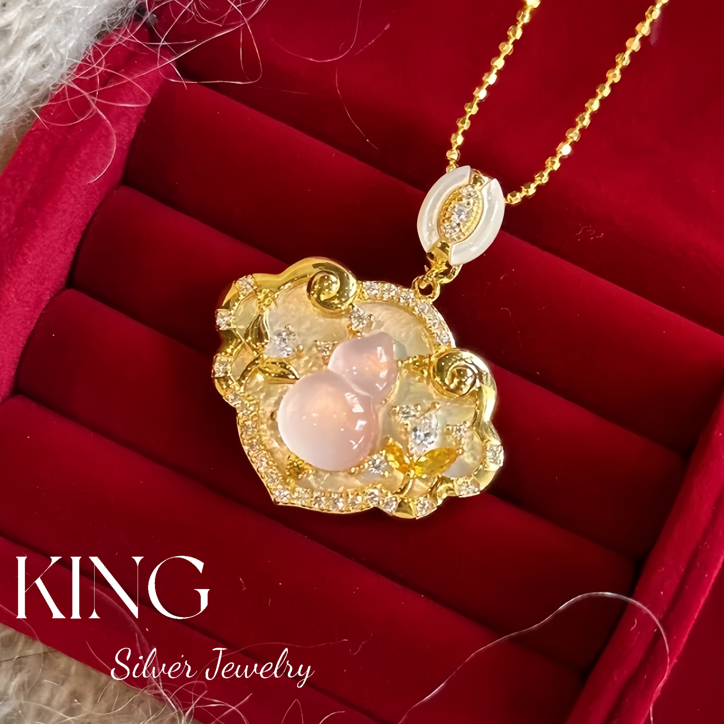 Ruyi Gourd | King Silver Jewelry 925 Silver Gold-Plated Pink Crystal Gourd White Mother-Of-Pearl Vintage Sterling Silver Necklace