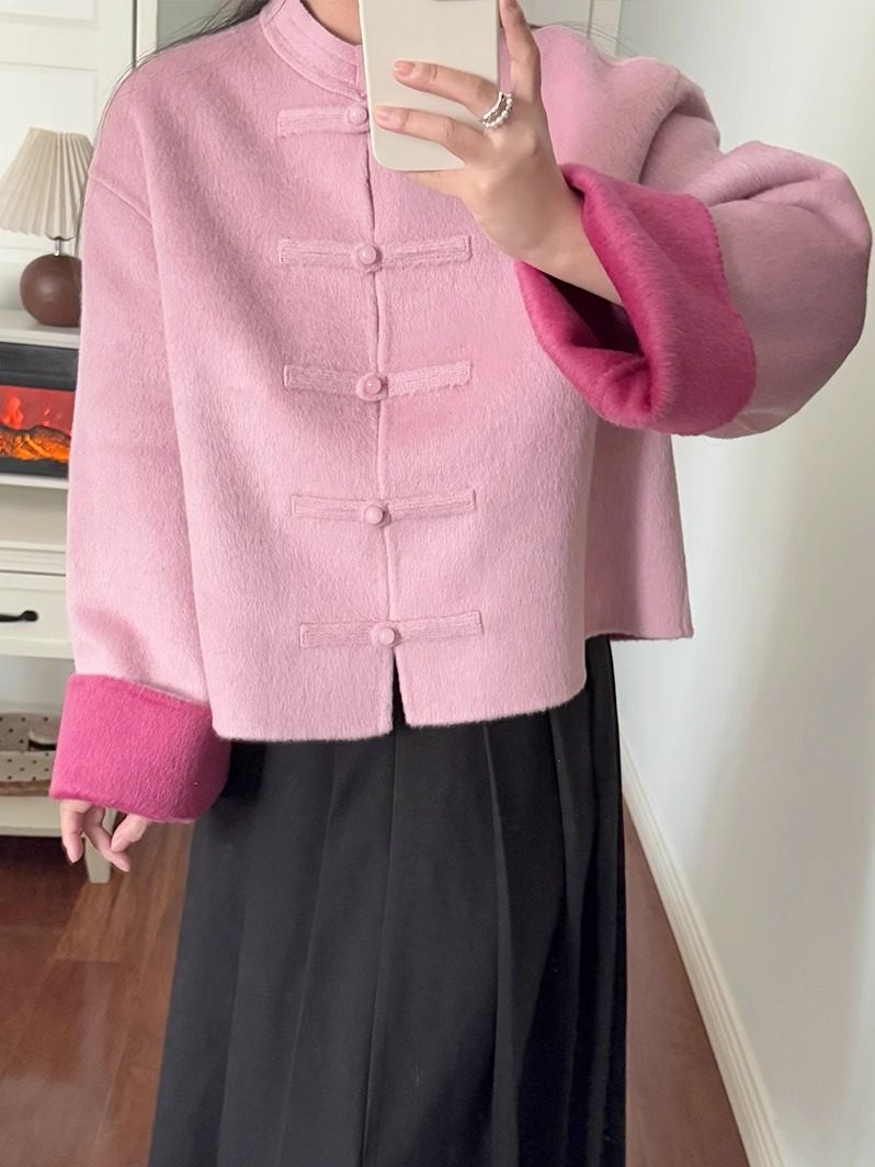 New Chinese-Style National Trend Pink Buttoned Sheep Wool Double-Sided Woolen Handmade Short Coat for Women 2025 Autumn and Winter New Model