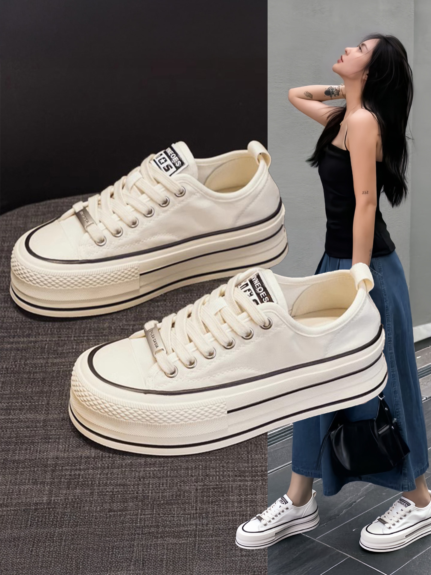 Hong Kong Style Cute Thick-Soled Canvas Shoes for Women 2025 Spring and Autumn Thin White Shoes Comfortable Ice Silk Casual Shoes