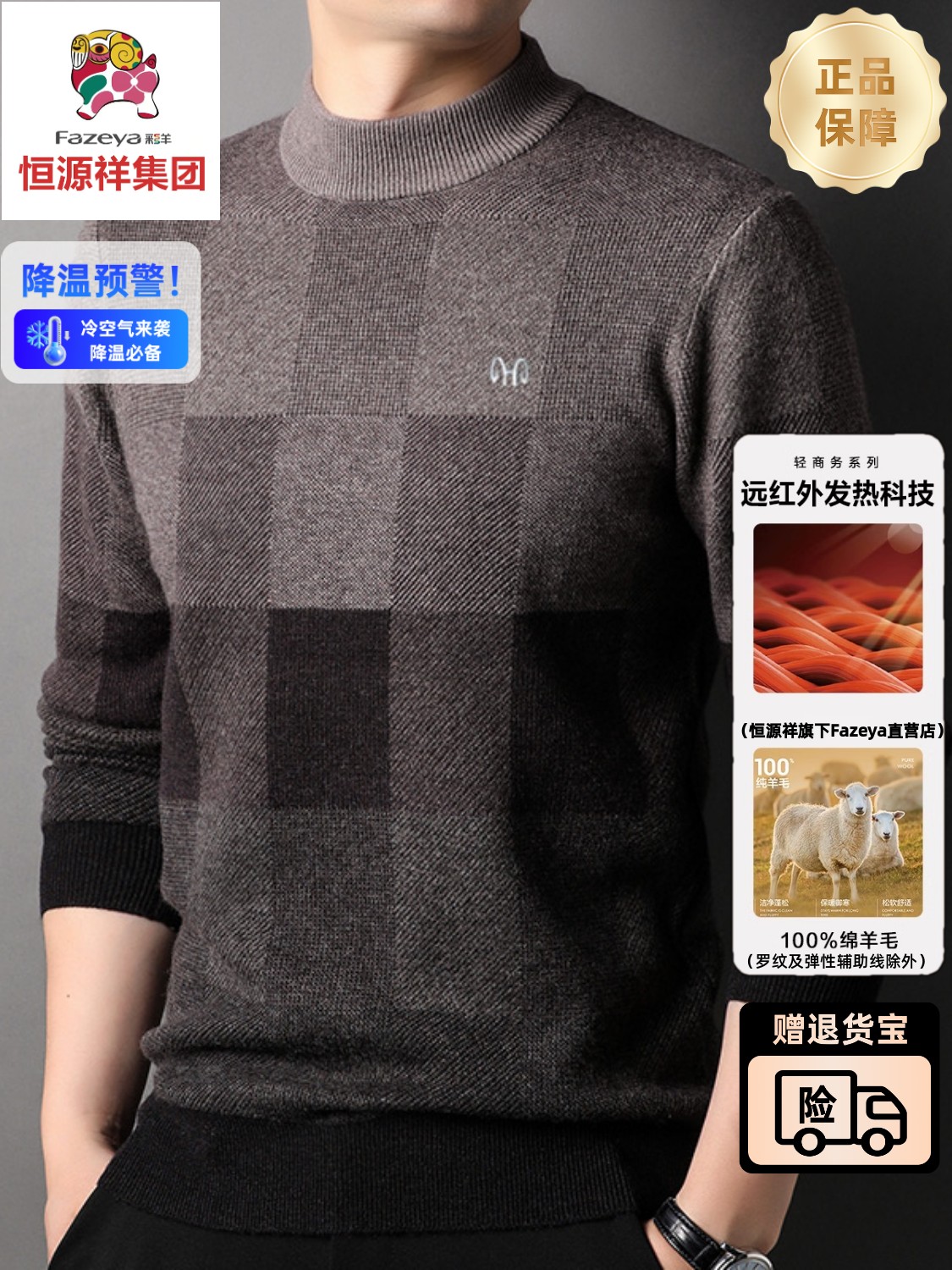 Hengyuanxiang Group Caishang Middle-Aged Men's Wool Sweater Thickened Winter Half-Turtleneck Knitwear 100% Pure Wool