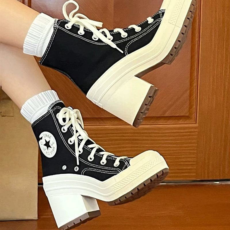 Fashionable High-Heeled Chunky Canvas Shoes for Women 2025 New Round-Toe Lace-Up Height-Increasing Versatile Thick-Soled High-Top Shoes White Shoes