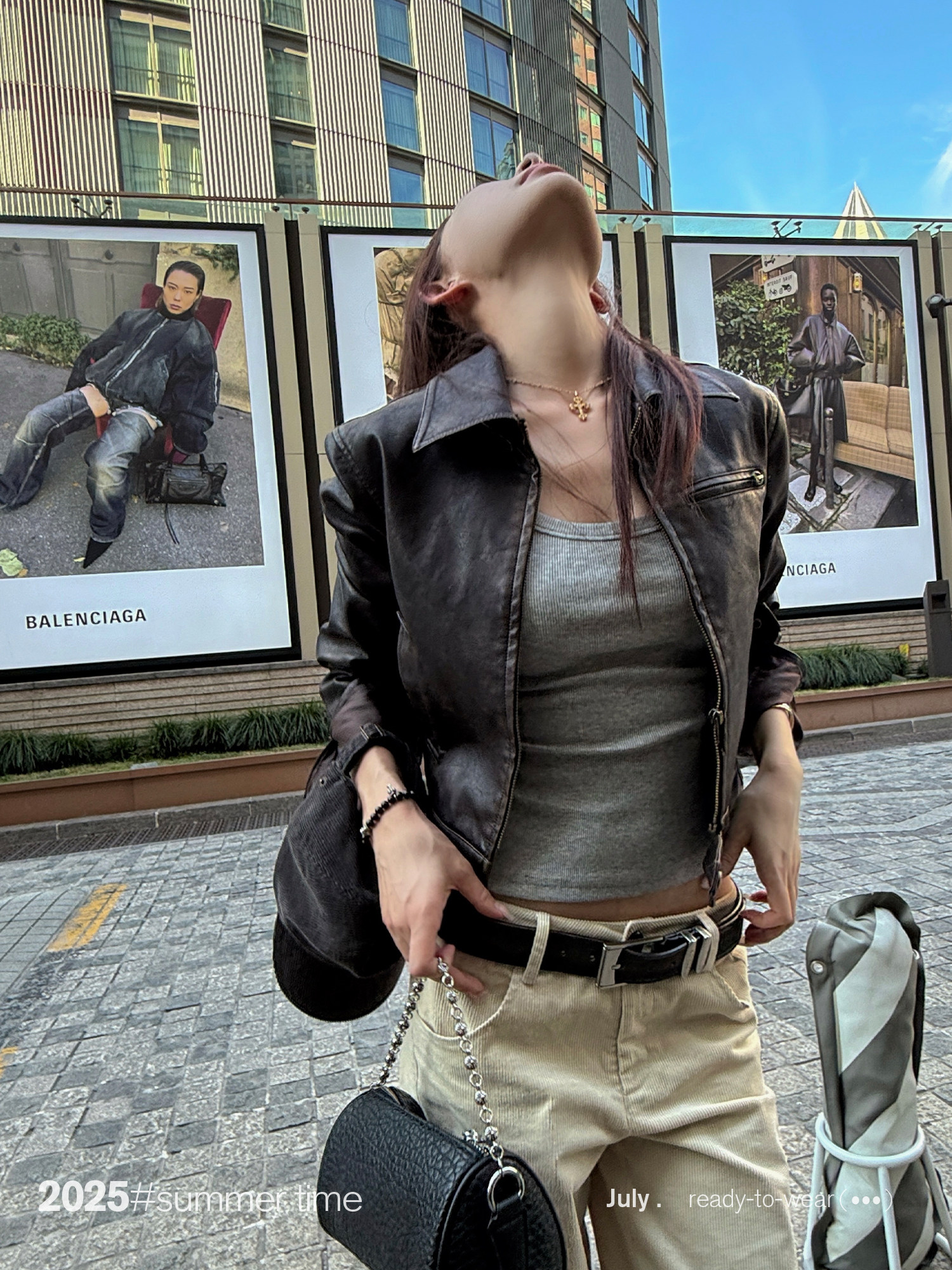 Sunoneone Cool and Stylish American-Style Short Leather Jacket for Women, Spring Slim-Fit Pu Retro Biker Jacket Top