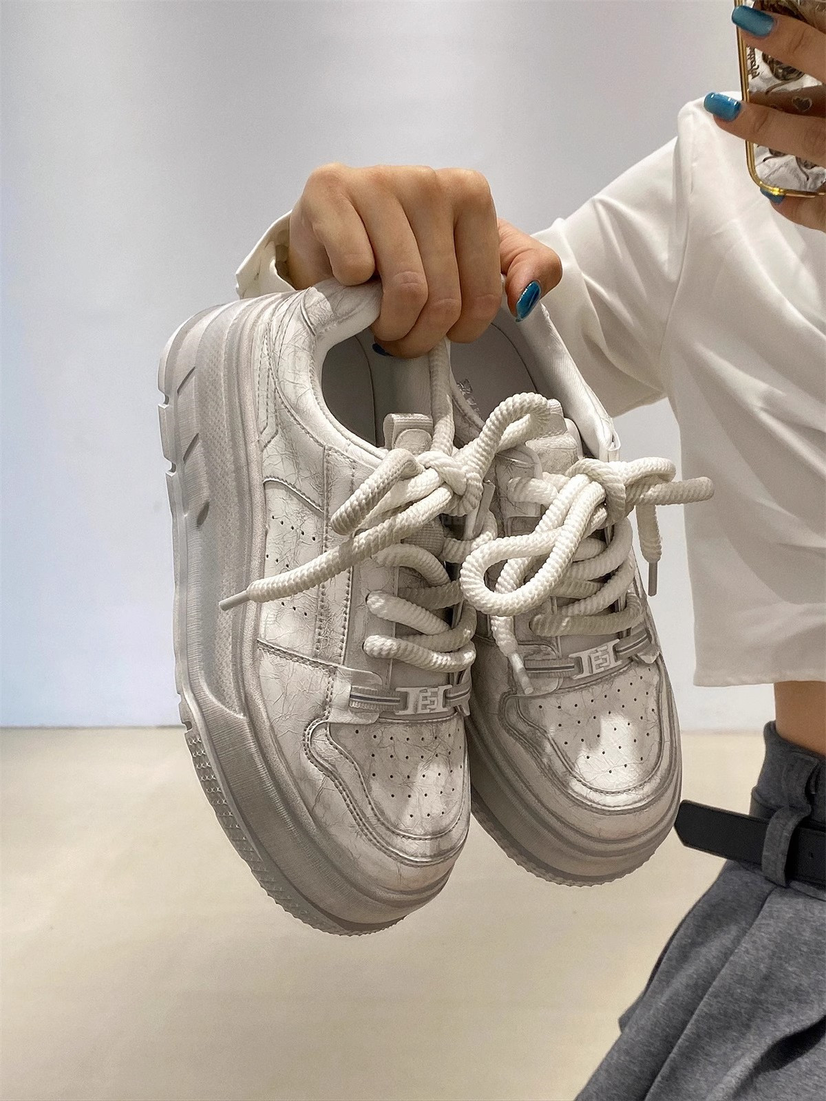Hong Kong Genuine Leather Distressed Casual White Shoes for Women 2025 Spring and Autumn Dirty Shoes Thick-Soled Versatile Platform Shoes Height-Increasing Sneakers