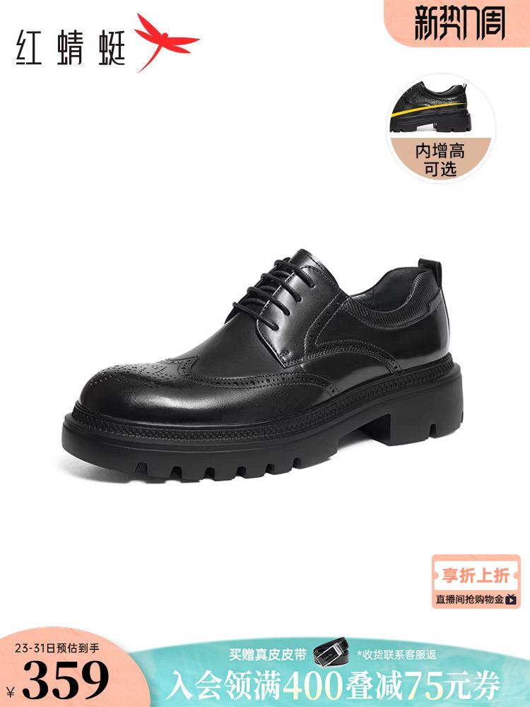 Red Dragonfly Ideal Leather Shoes for Men, Young Style, Thick Sole, Height-Increasing Derby Shoes, Brogue Shoes for Groom, Wedding Shoes