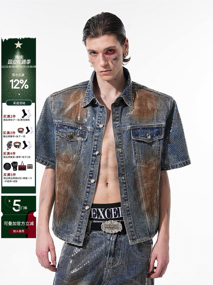 Startexceedend Niche Hot-Stamped Sequin Short Denim Jacket for Men, Spring and Summer Vintage Shoulder-Padded Short-Sleeve Jacket