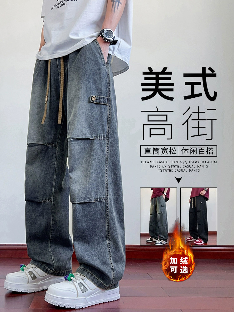 American-Style Pleated Jeans for Men, Autumn and Winter, Fleece-Lined, Loose Straight-Leg, Casual Pants for Teenagers, Straight-Leg Cargo Pants