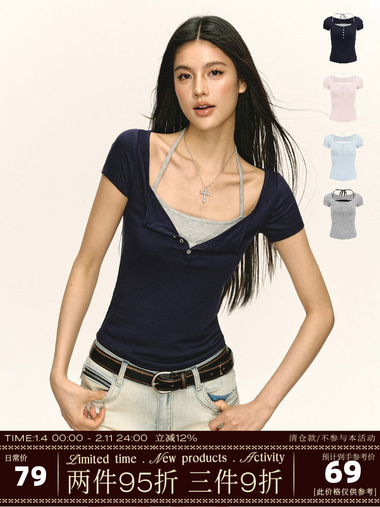 Ariseism American Retro Design Rhinestone Fake Two-Piece Short-Sleeve T-Shirt for Women, New Summer Slim-Fit Top