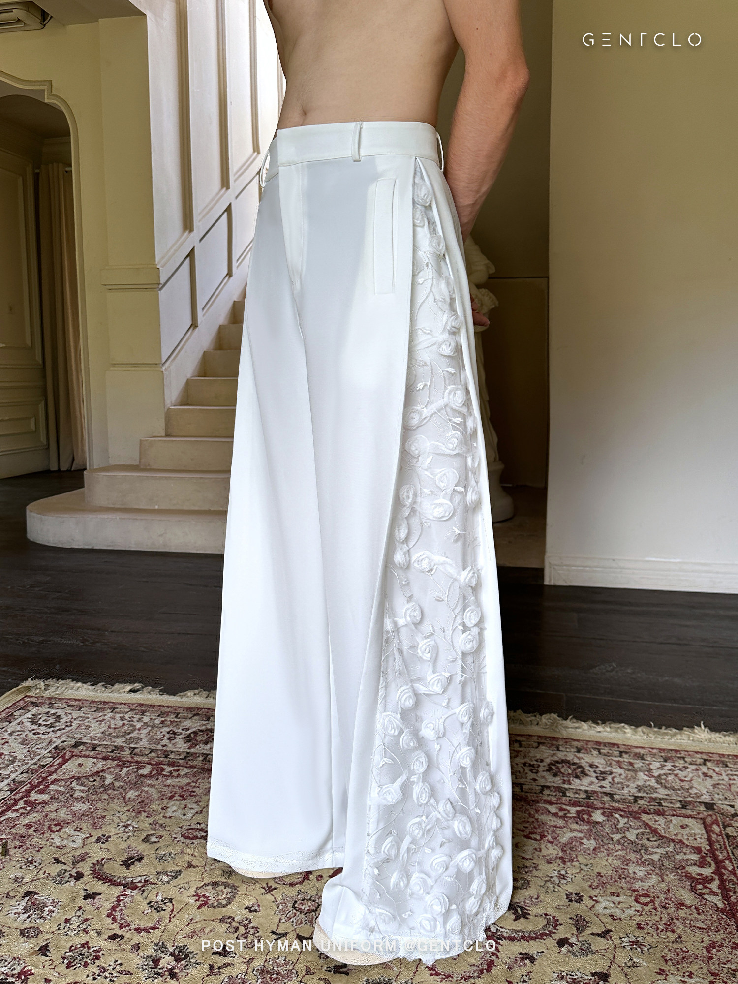 「Jeykoco」Unique Design Lace Floral Patchwork Casual Wide-Leg Pants for Men, Layered Suit Pants Skirt