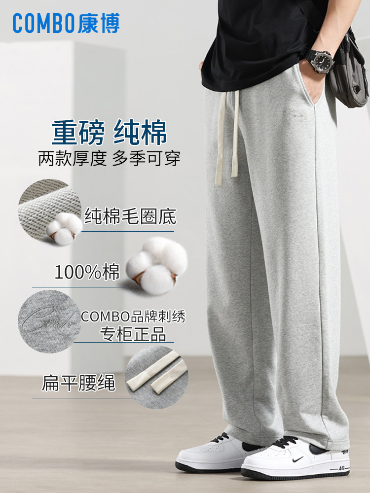 Kangbo 100% Cotton Sweatpants for Men, Heavyweight Spring, Autumn, and Summer Thin Pure Cotton Terry Skin-Friendly Large Size Straight-Leg Sports Pants