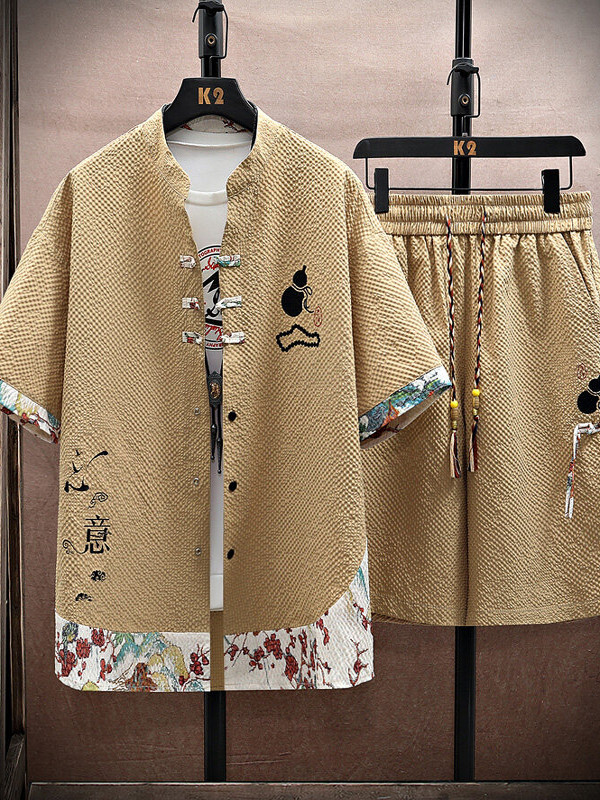 Chinese Style Short-Sleeved Suit for Men, Summer Thin Shirt and Shorts Two-Piece Set, Loose Casual National Trend Hanfu Tang Suit