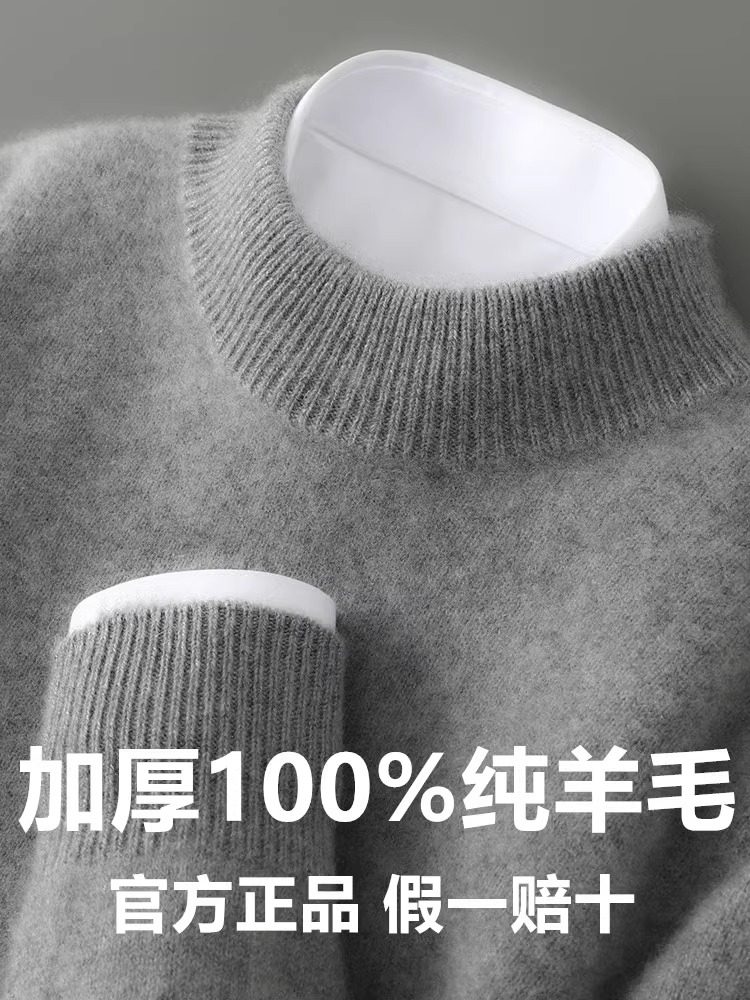 Double-Layered Thick 100% Pure Wool Sweater for Men, Autumn and Winter, Half-High Collar, Soft and Loose Pullover Knit Base Layer Sweater