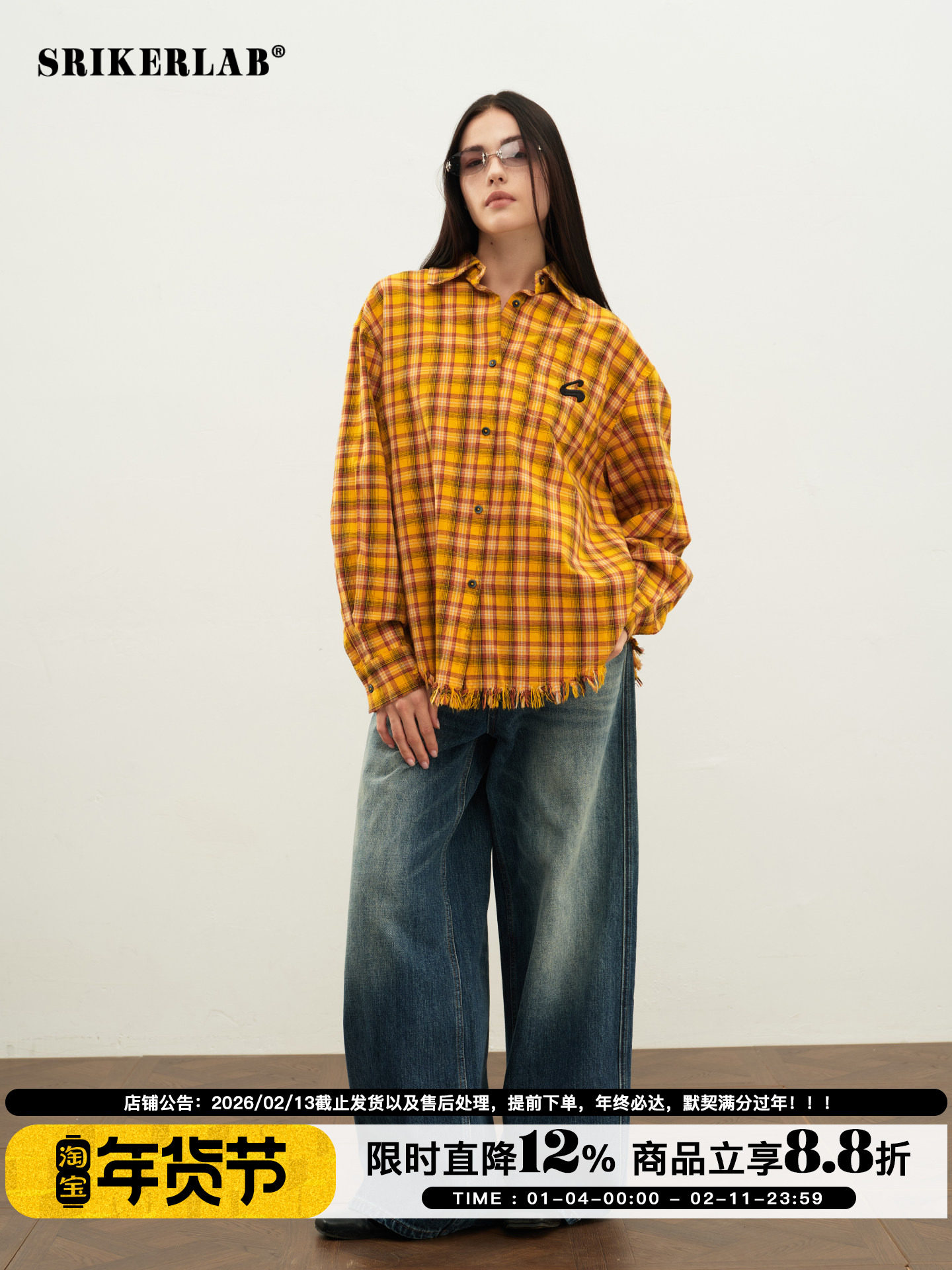 Srikerlab Original American-Style Dopamine Yellow Plaid Shirt with Raw Hem Cardigan Top and Lapel Jacket