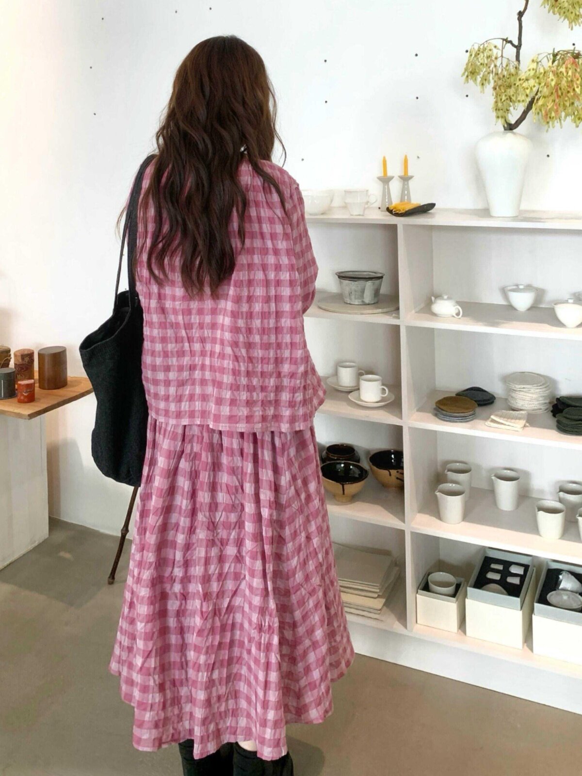 Raspberry Pink Age-Reducing Plaid Round Neck Trumpet Sleeve Loose Design Shirt Lazy Style High Waist Skirt Suit for Women Autumn