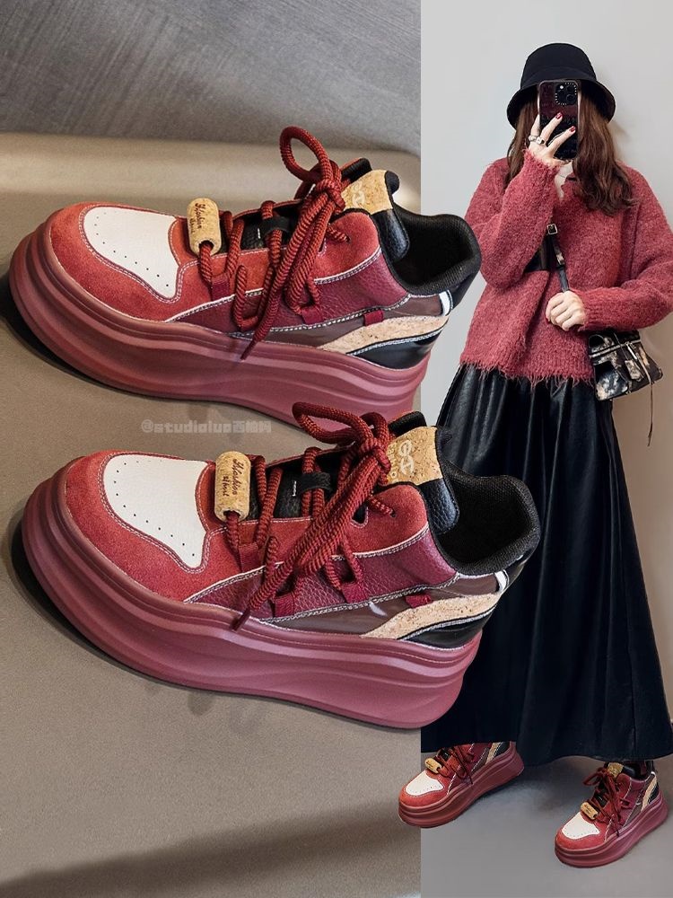 Sanli Genuine Leather Fashionable Panda White Sneakers for Women 2025 Spring and Autumn Round Toe Platform Thick-Soled Versatile Casual Sports Sneakers