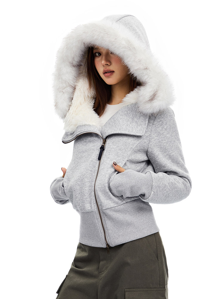 Apea American-Style Diagonal Placket Plush Lining Fur Collar Cotton Jacket Winter Short Slim Fit Hooded Cardigan Sweatshirt
