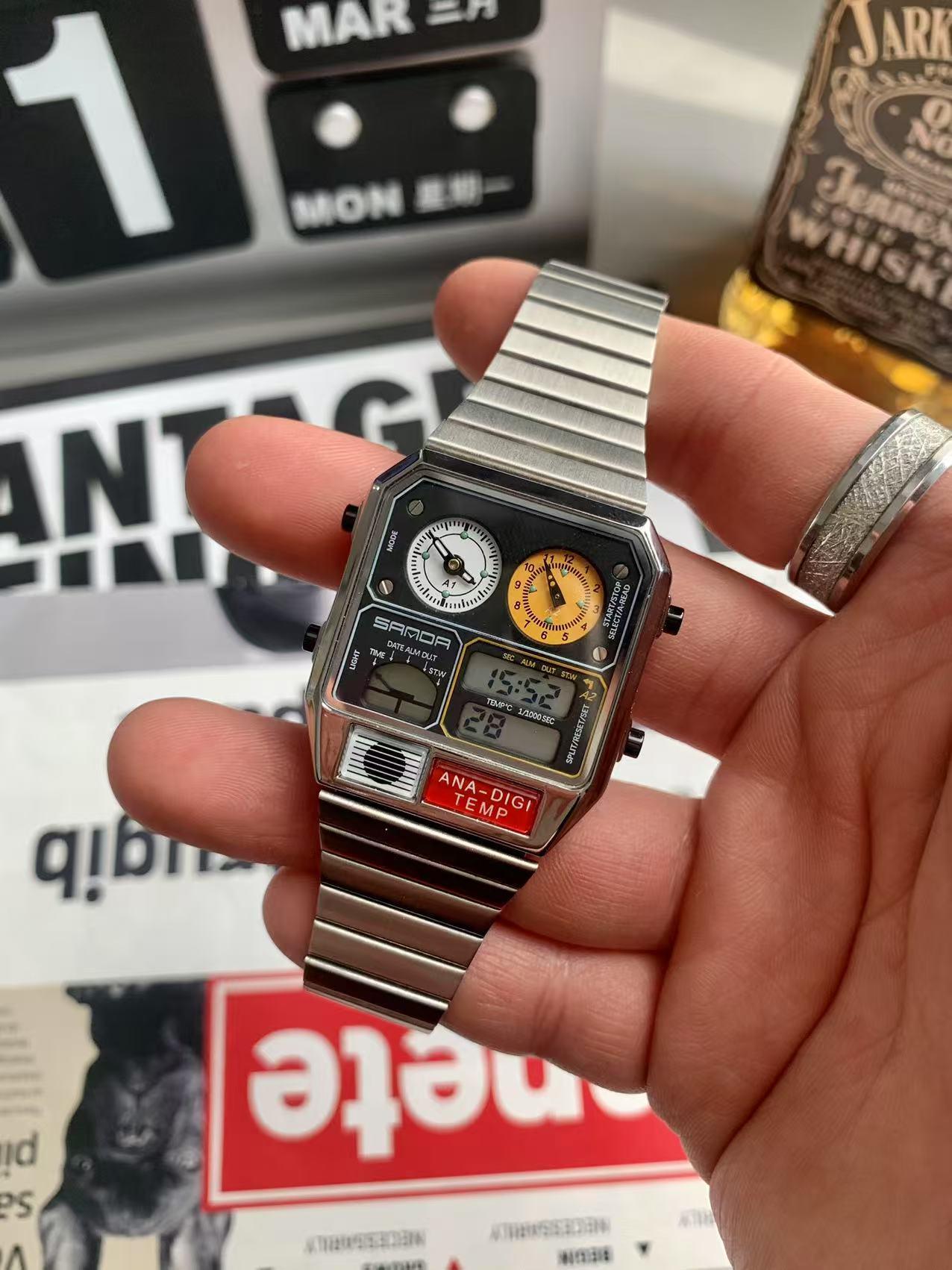 Retro Square Watch Men's Multifunctional Outdoor Sports Ultra-Thin Steel Band Waterproof Luminous Alarm Clock Dual Display Digital Watch