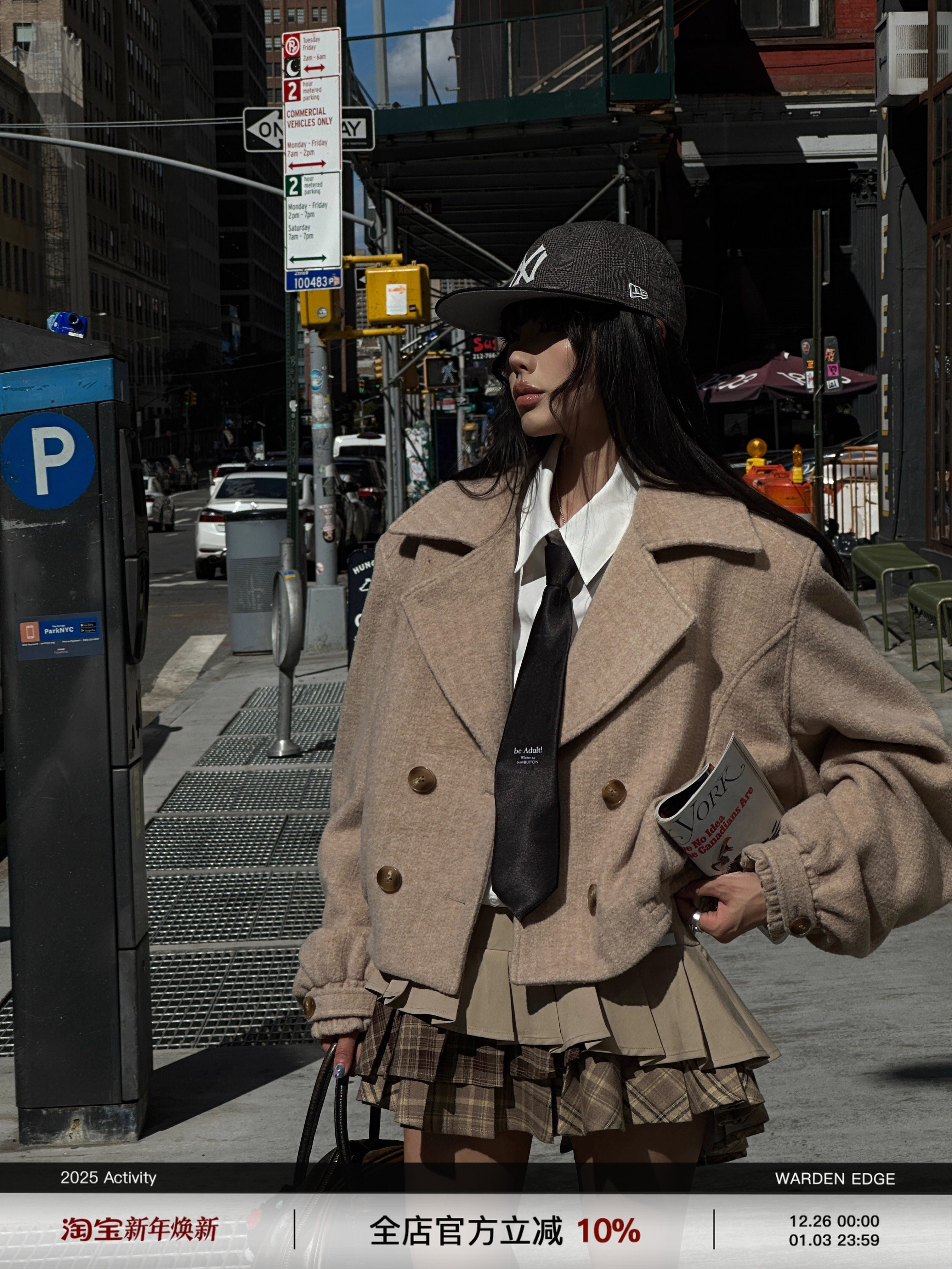 Hanhaotian Warden Edge Mocha Mousse Khaki Wool Coat for Women Winter Double-Breasted Woolen Coat