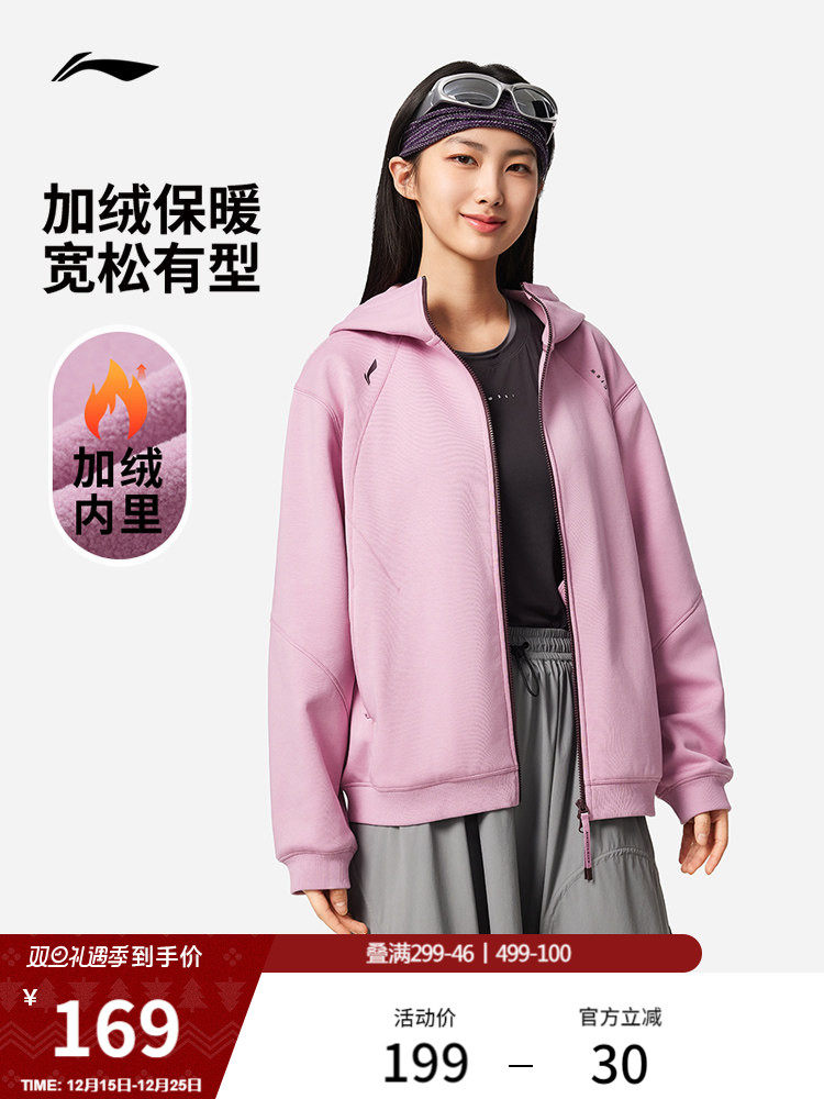 Li-Ning Women's Winter Walking Jacket, New Thickened Fleece-Lined Zip-Up Sports Sweatshirt for Women