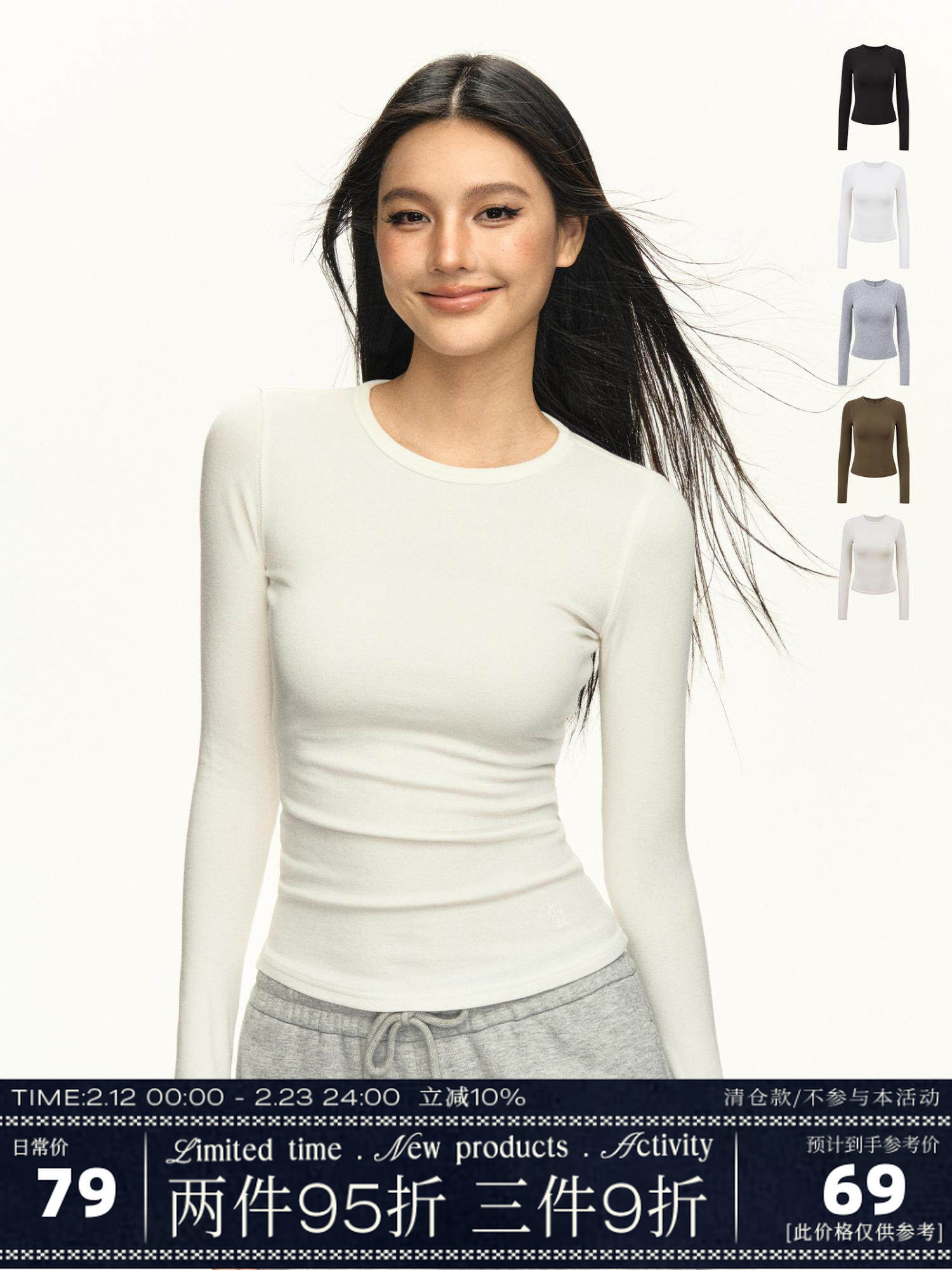 Neva Hu Half Sugar Mocha White Round Neck Long Sleeve T-Shirt for Women Slim Fit Inner Layer Slimming Knitted Base Shirt Top