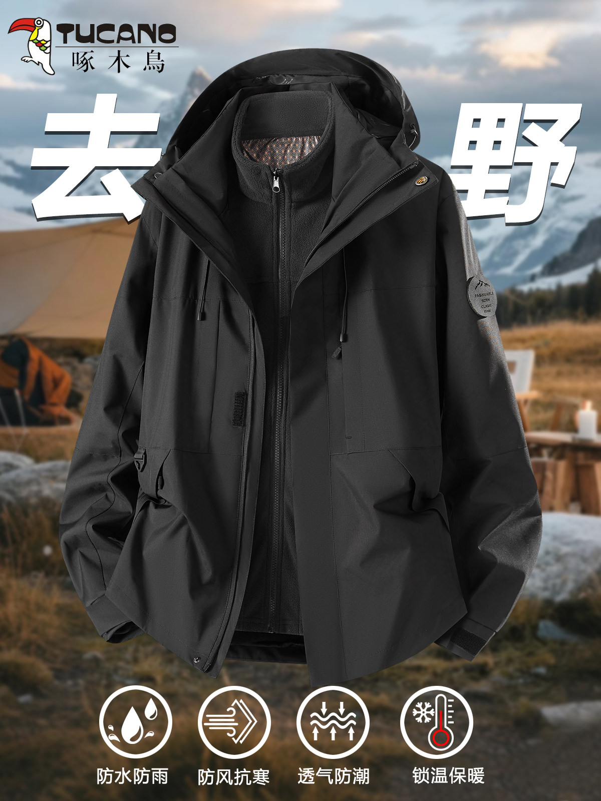 Woodpecker Brand Jacket for Men and Women, 2025 New Autumn and Winter Outdoor Detachable Windproof Three-In-One Mountaineering Jacket