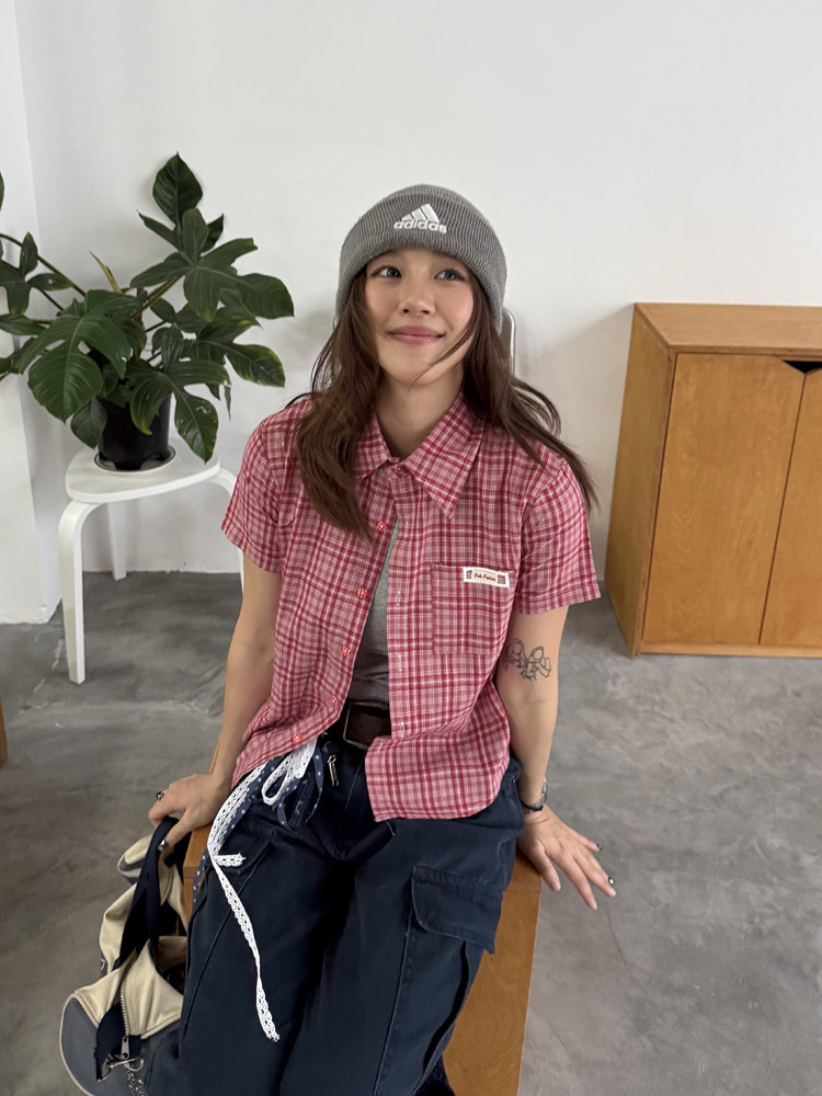 Chuanchuan Yijia American-Style Plaid Regular Shoulder Short-Sleeve Slim-Fit Shirt for Women, New Summer Casual Design Short Shirt